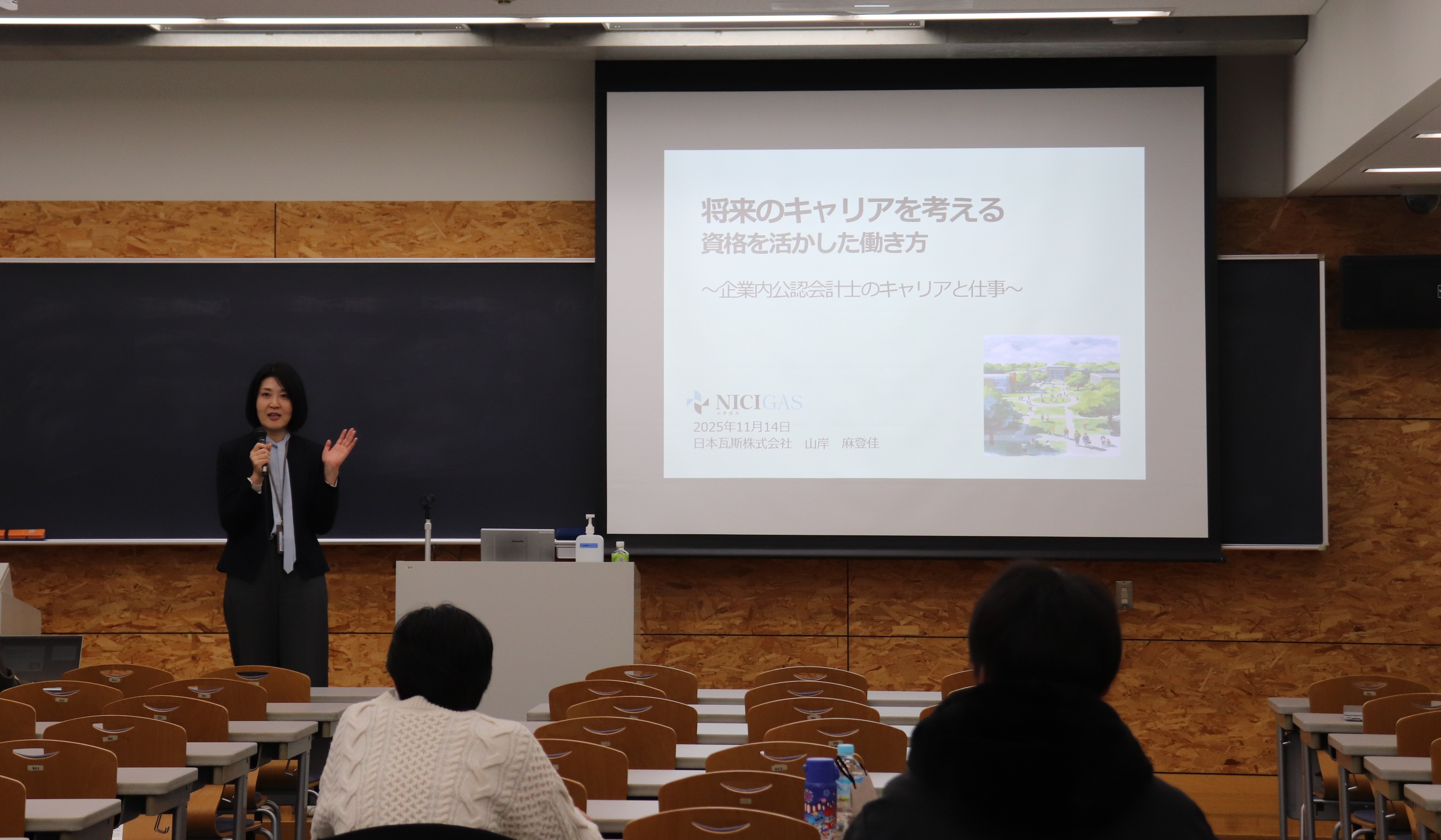 11月14日(金)に令和7年度第3回法学部特別講演会を開催し、山岸麻登佳氏(公認会計士・株式会社日本瓦斯執行役員/コーポレート本部経財部長)より「将来のキャリアを考える:資格を活かした働き方 〜企業内公認会計士のキャリアと仕事」と題したご講演をいただきました。 本講演は、山田剛志教授の「会社法C」の授業の一環として行われ、多くの学生が熱心に聴講しました。 講演 会場