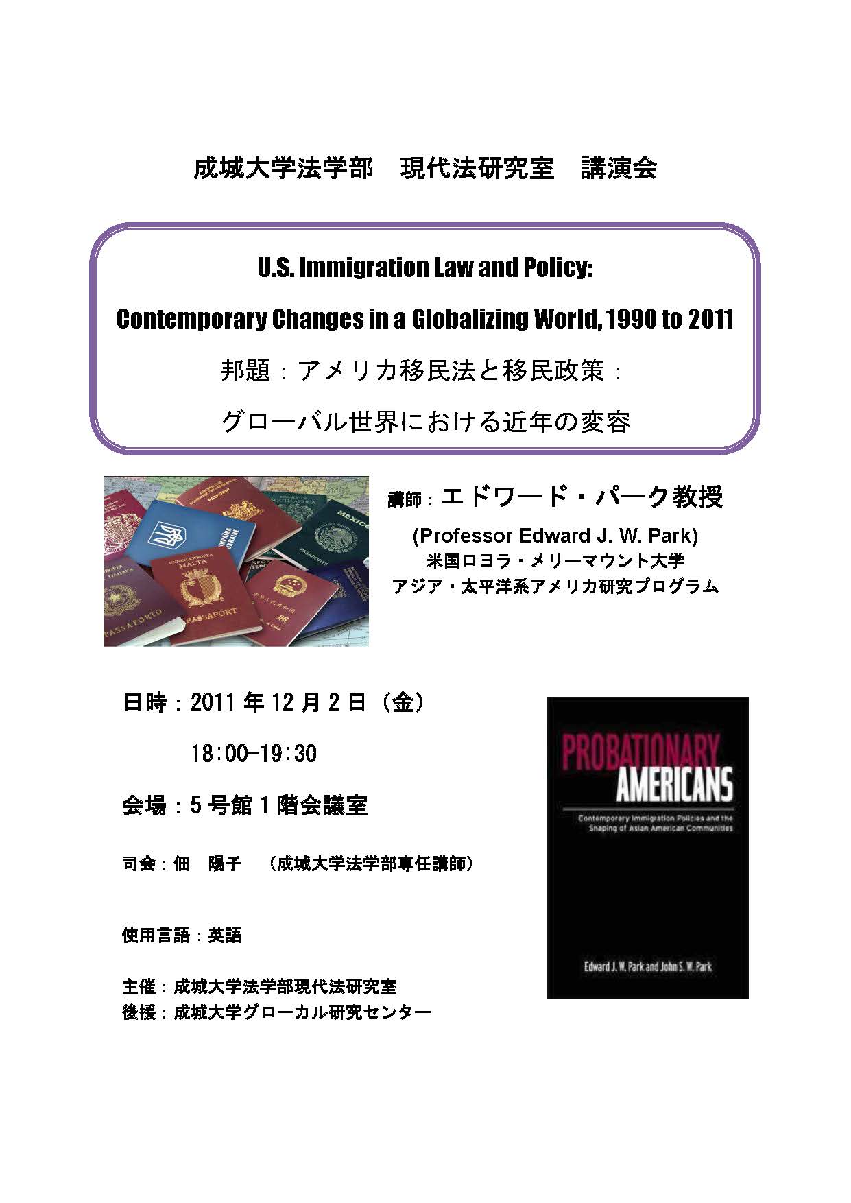 | 1.テーマ | U.S. Immigration Law and Policy:Contemporary Changes in a Globalizing World, 1990 to 2011 邦題:アメリカ移民法と移民政策:グローバル世界における近年の変容 |